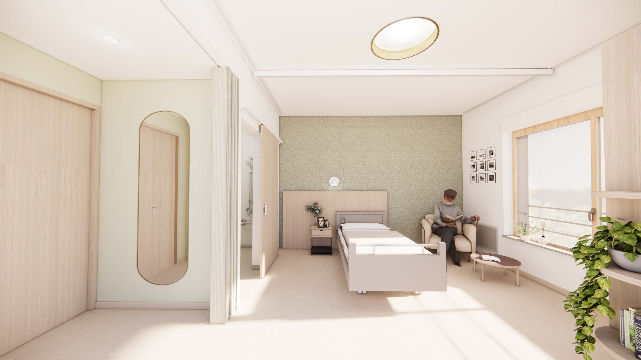 Les chambres neuves ou restructurées font à minima 20 m², constituées d’une entrée protégée par un rideau pour l’intimité, d’une salle d’eau conforme PMR, d’un espace nuit affirmé par une tête de lit et un mur de couleur douce. La baie permet une vue dégagée sur un espace vert ou la forêt depuis le lit.