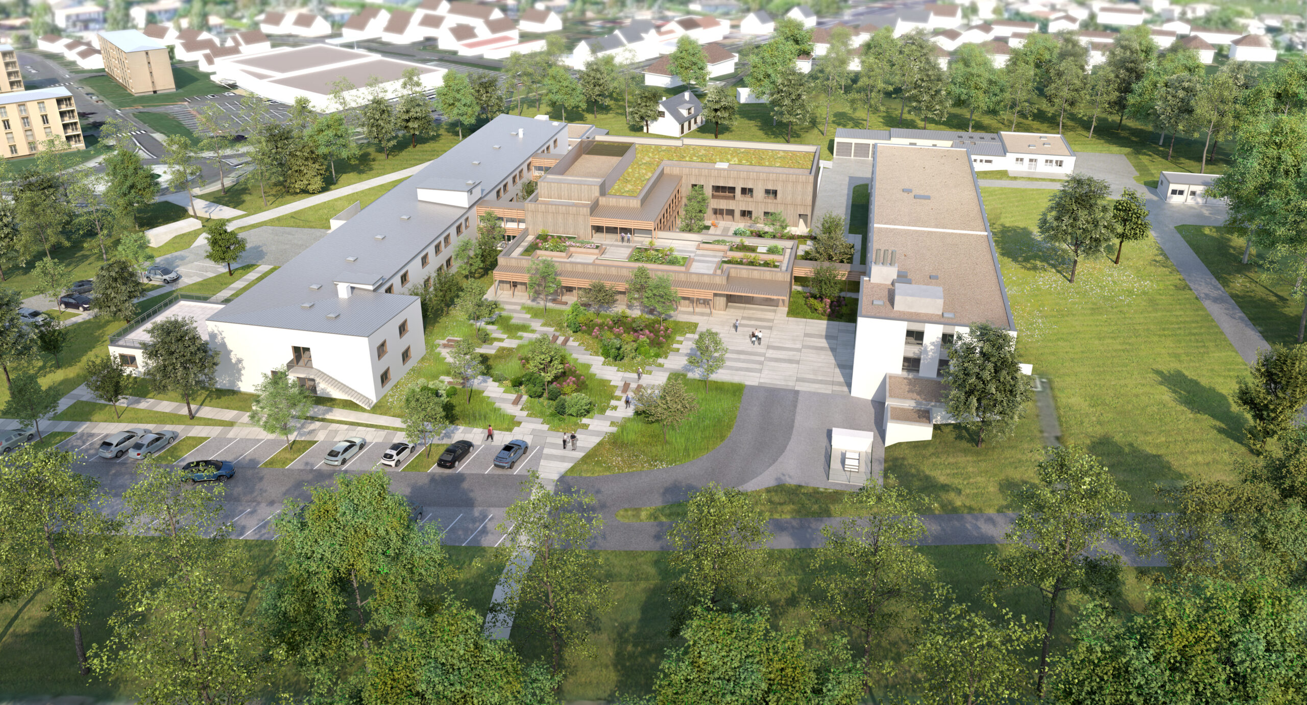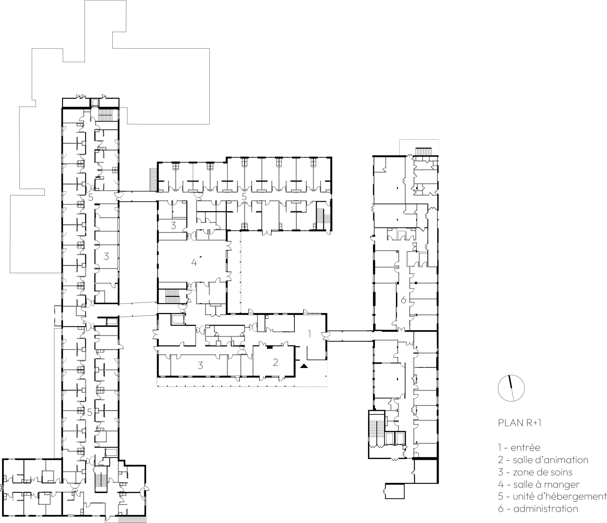 L’extension vient se placer au centre du système, sa façade principale bardée de bois accompagnée de son grand jardin arboré devient majeure, son architecture retrouve une image plus domiciliaire qu’hospitalière, réaffirmant une cohérence d’établissement.