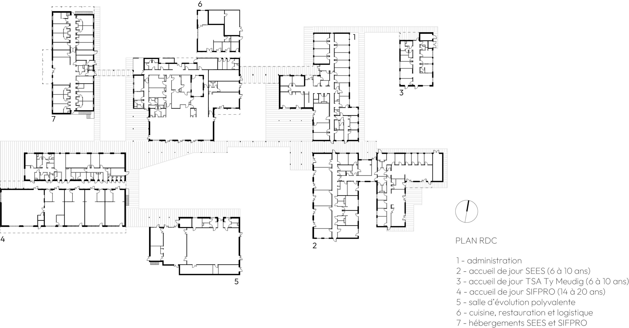 Le projet de reconstruction de l’EPMS de Kerampuilh est conçu comme un village regroupant 7 bâtiments aux fonctions complémentaires.
