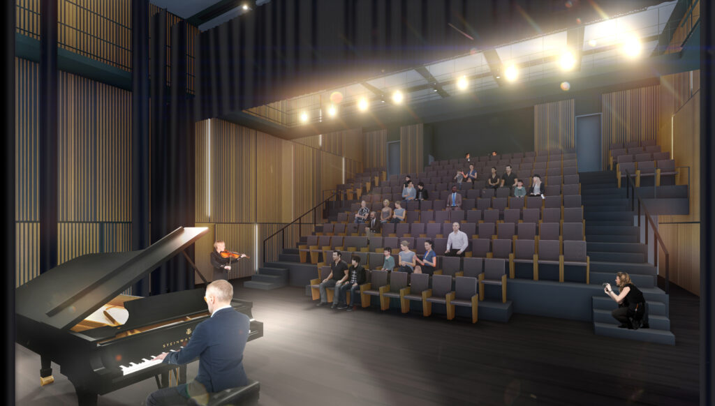 Auditorium de 200 places, 3 grandes salles de musique collective, 5 studios et un studio d’enregistrement