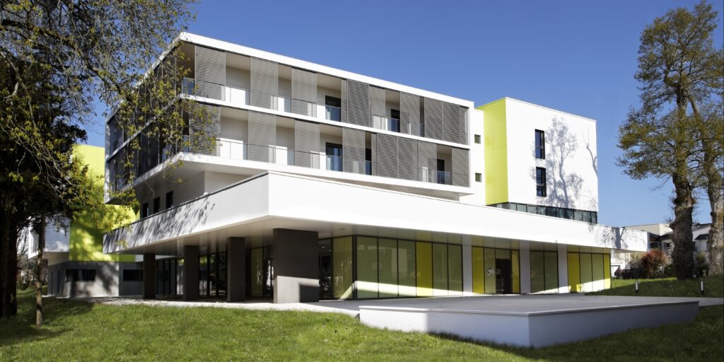 165 lits dont 25 lits médecine, 30 lits SSR, 96 lits Ehpad, 14 lits Upad, pharmacie, Radiologie, Cuisine centrale – HQE